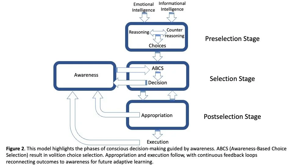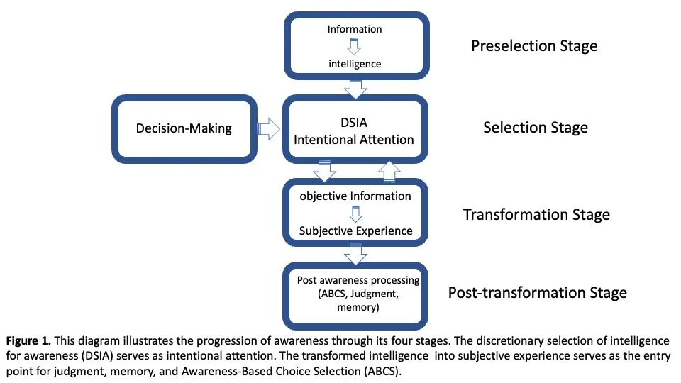 From the perspective of the Trilogy Theory of Consciousness (TTC), awareness is the base for decision-making but on its own unfolds across four distinct stages—a framework that explains how intentional attention and Discretionary Selection of Intelligence for Awareness (DSIA) prepare the basis for free-willed, awareness-based decisions (Figure 1).