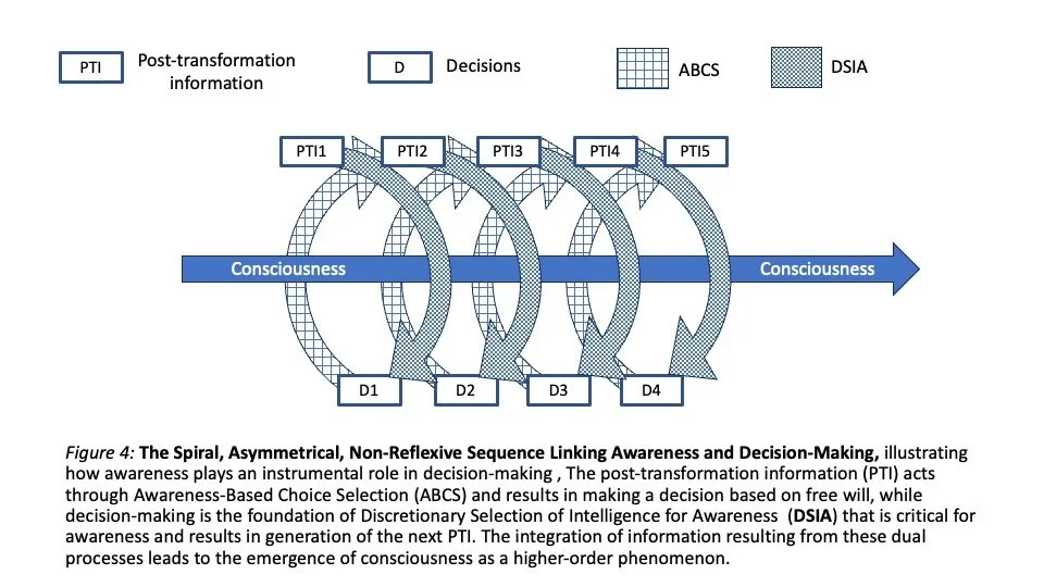 The story of awareness does not end at the transformation stage. In fact, its function begins here, as the precepted information serves as the foundation for further mental actions including the decision-making process (Figure 4). As the result of generation of post-transformation information (PTI), a spiral, asymmetrical, non-reflexive sequence will be formed that links awareness and decision-making. In this scheme, PTI acts through ABCS and results in making a decision based on free will, while decision-making is the foundation of DSIA that is critical for awareness and results in generation of the next PTI. The integration of information resulting from these dual processes leads to the emergence of consciousness as a higher-order phenomenon.