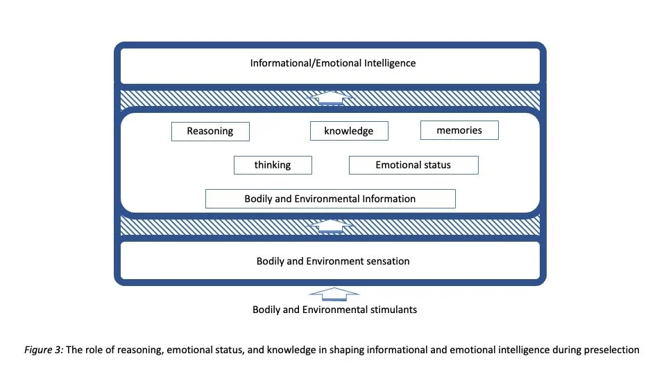 In the preselection stage, preparatory cognitive processes receive all information from bodily sensors that convey data from the inner body and the surrounding environment (Figure 3). Additionally, thinking processes, reasoning, memories, knowledge, and emotional information are integrated, forming either informational or emotional intelligence that competes within the mind at this stage. Dennett’s explanation of the awareness process only accounts for the preselection stage within TTC, which aligns with the late selection theory of attention (Deutsch & Deutsch, 1963; Norman, 1968), the spotlight theory of attention (Fernandez-Duque & Johnson, 2002), and the unison theory of attention (Desimone & Duncan, 1995; Reynolds & Desimone, 2000). However, these theories deviate from TTC when addressing the selection stage of awareness, as explored below.