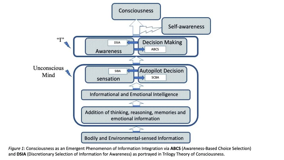 The TTC posits that humans are composed of three fundamental elements: the body, the mind, and the "I". In this framework, the "I" emerges from the interplay between two cognitive functions: "Awareness-Based Choice Selection," or free will, and "Discretionary Selection of Information for Awareness," or intentional attention. This interaction acts as the gateway linking the unconscious mind to awareness, forming the basis for the experience of self-awareness (Figure 1).