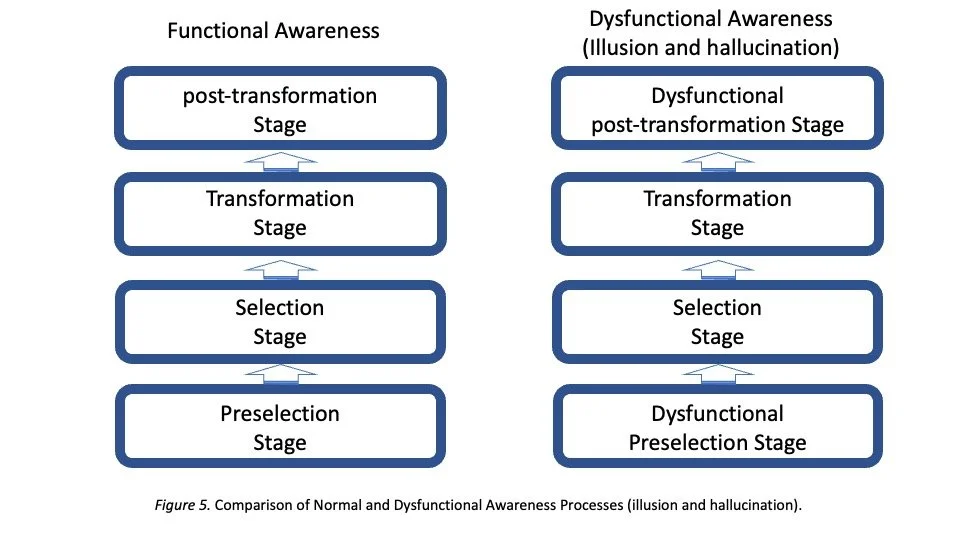 As described above, awareness is a key mental function composed of several stages, and many details of this complex function are yet to be fully understood. However, illusion is also a form of awareness—an awareness arising from a subject that is prepared in the preselection stage (Figure 3). While it may seem that the problem with illusion is misinterpretation at preselection, where the information from bodily and environmental sensory input generates erroneous or invalid data, there is also an issue in the post-transformation stage of awareness (Figure 5). Here, the transformed information is matched with memories, knowledge, and reasoning, yet individuals experiencing illusions are often unaware of their false beliefs or lose their touch with reality due to a simultaneous problem at the post-selection stage of awareness.