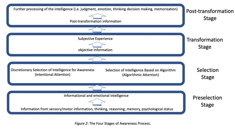 Based on TTC, awareness is the keystone to consciousness and is not the end product of the interpretation of reality but rather the stepping stone for understanding the world and making decisions based on free will through the mechanism of awareness-based choice selection (ABCS). According to TTC, the awareness process comprises four distinct stages: preselection, selection, transformation, and post-selection stages.